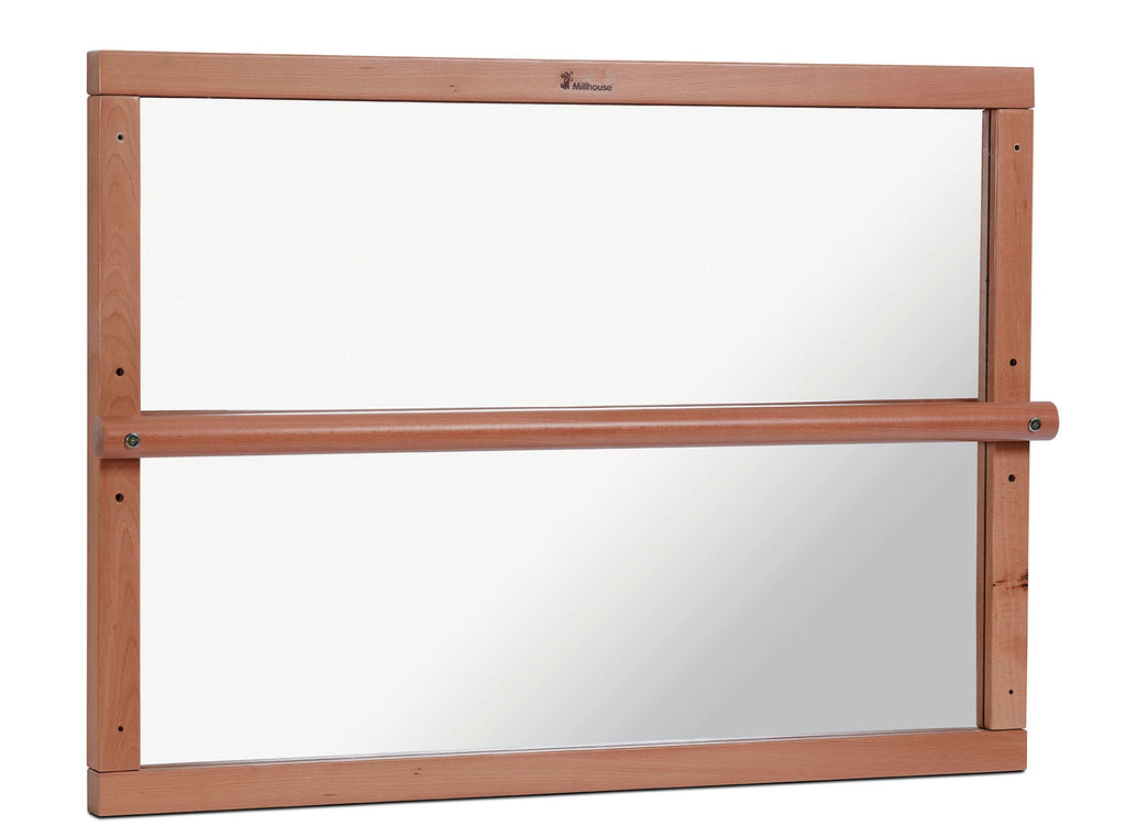 Beautiful solid beech pull up and play mirror, ideal for baby and toddler rooms. The easy grip hand rail enables children to pull themselves up and steady their feet whilst they enjoy exploring the reflections in the mirror. The mirror can be used without the handrail for role play and sensory areas.