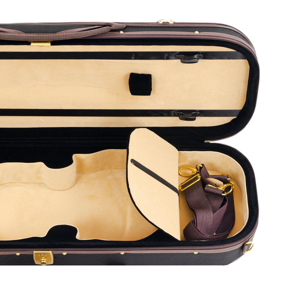 - Black case with brown trim and gold hardware