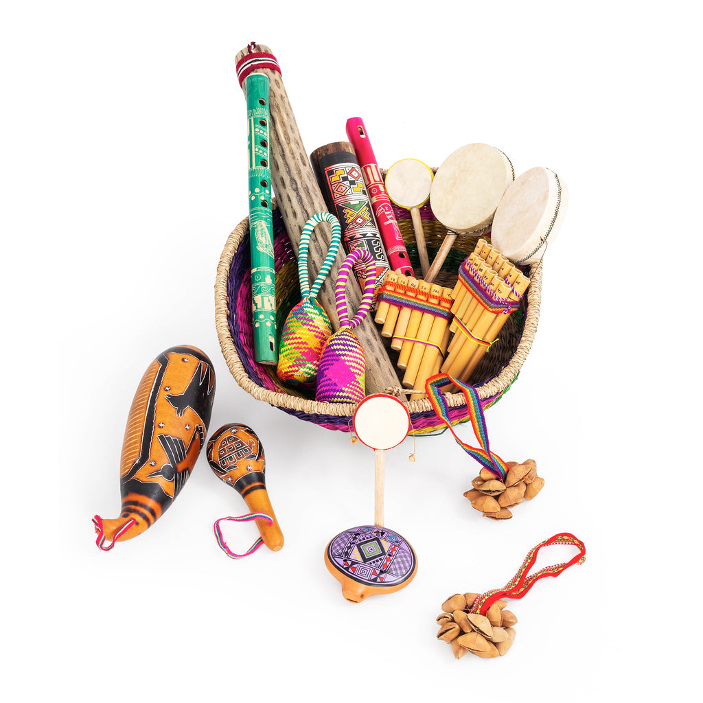 - A colourful woven basket filled with brightly decorated, hand painted instruments