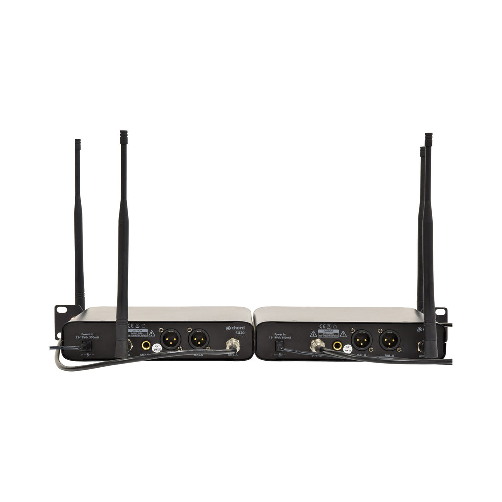 Chord SU20 compact dual UHF wireless microphone set - Carrier frequencies: 863.42MHz (Red) + 864.3MHz (Green)