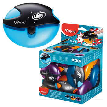 One hole metal pencil sharpener which never jams. One press of the button and broken leads are easily ejected. Available in assorted colours. Range of desk top models. Collects their own shavings. Clean and tidy in use.