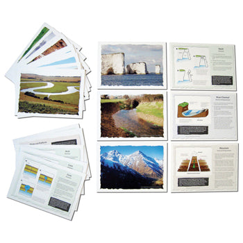 A5 Cards, each depicting a colour photograph of a specific geographical feature or landform. On the reverse is a simple step-by-step explanation of how the feature is formed, and an annotated sketch. These cards can be used for display purposes and supporting often difficult geographical concepts. Ideal for the non geography specialist teacher. Suitable for Key Stages 2 and 3.