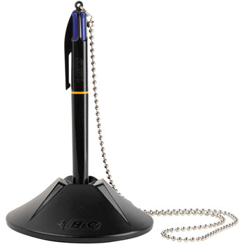 Also fits any BiC(R) 4 Colour Pen. 1mm medium tip. Desk pen with four blue long lasting ink cartridges in one. Stable weighted base and secure chain. Refillable.
