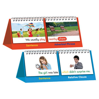 A double-sided flip stand which enables students to learn grammar structures in sentences. On one side are adverbials which are words or phrases for expressing place, time or manner. On the other side are relative clauses which are used to define or identify a noun. Picture examples and colour coding are provided to support understanding.