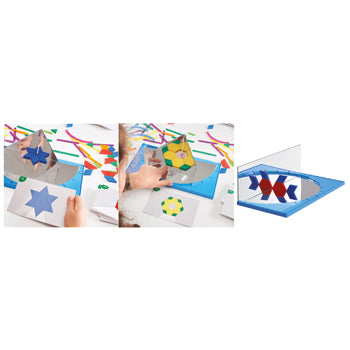This mirror set will stimulate children's imagination and allow them to explore symmetry and reflection with their creative designs. Set includes 3 x Vertical Acrylic Mirrors, 1 x Semi-circular Horizontal Acrylic Mirror, Plastic Frame with 15 Degrees Graduations, 30 x Pattern Blocks, 50 x Geostix and 64 x Double-sided Activity Cards in a sturdy plastic container.