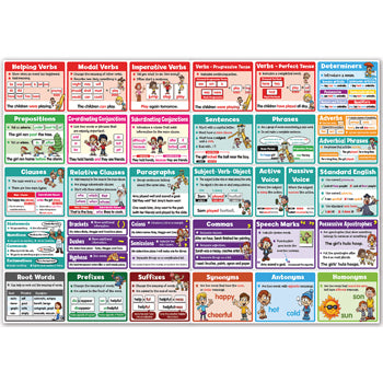 Simple explanations of each grammatical term in the UK curriculum are given on 310 x 260mm panels. Display as a wall chart, a frieze or cut into individual posters for class lessons. This KS2 frieze has 33 panels and measures 10.2m.