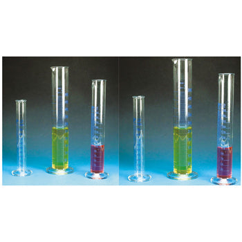 Graduated borosilicate glass cylinder with spout, tall form with rounded base. Blue graduations. Class B.