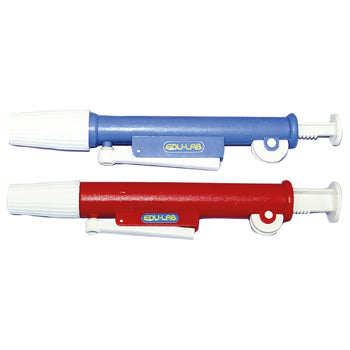 Fast-release pipetting device for precise pipetting or zip-quick emptying. The thumb wheel can be rotated to precisely draw up or dispense liquids or the releaser can be pushed in for virtually instant emptying. The moulded chuck has a silicone rubber collar inside to hold various pipettes of standard sizes. It resists acids and alkalis and can be easily disassembled for thorough cleaning.
