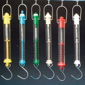 High quality tubular spring balances which are colour coded and scaled in both Newtons and grams. The stainless steel spring mechanism is clearly visible and zero adjustment is incorporated.