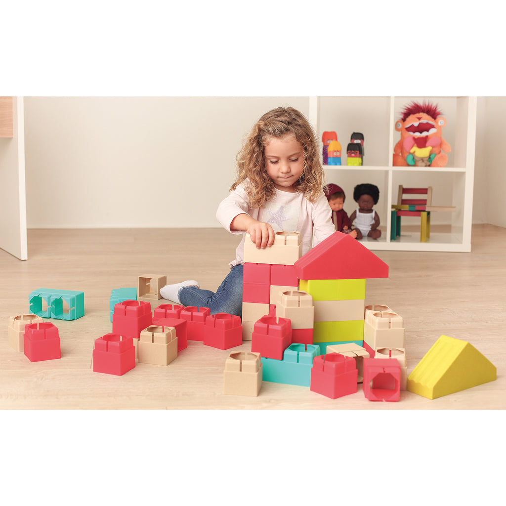 Set of 40 pieces. Big building blocks, made in bioplastic derived from sugar cane, a flexible and eco-friendly material. Suitable for age 18 months+.