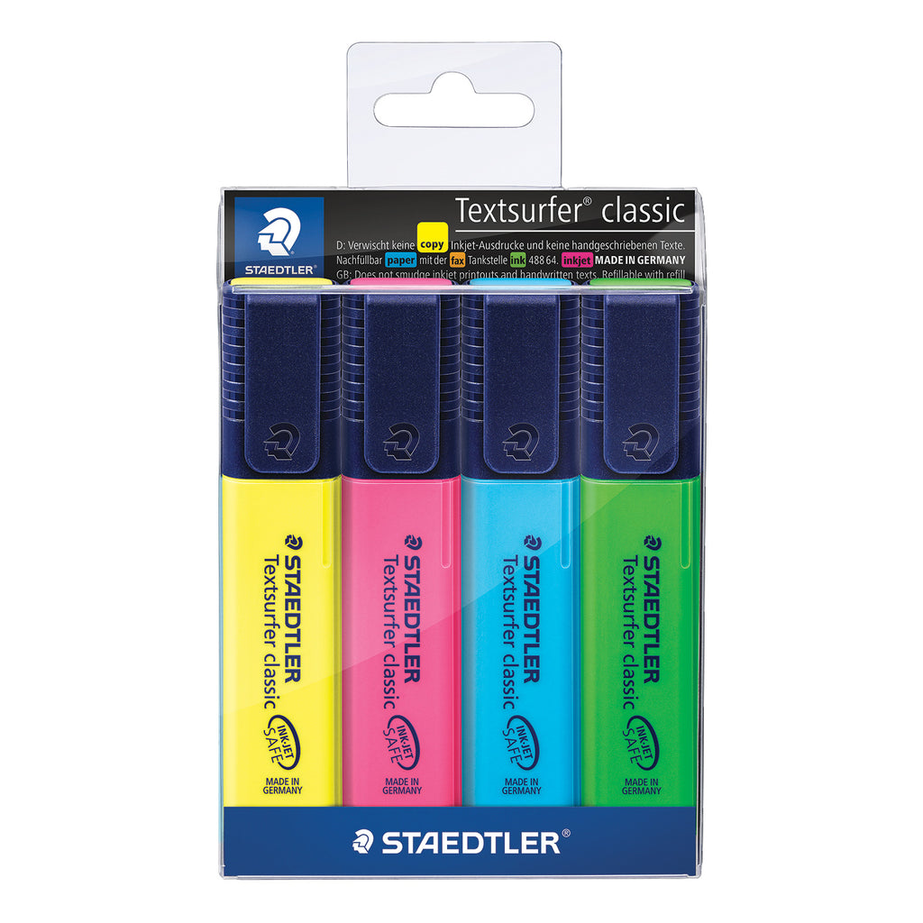 Highlighter pens by STAEDTLER® with a large reservoir containing bright colours of Textsurfer ink. Fast-drying non-smudge, inkjet safe colours which can be happily used on printouts or handwritten text without issue. Ultra-soft chisel tip approx. 1-5 mm. The barrel, cap & end plug are up to 97% recycled and can be refilled for continued, sustainable use.