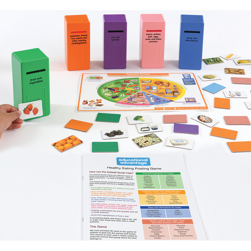 Learn all about healthy eating and the Eatwell Guide with this fun posting game. Children take turns picking a card printed with a real-life photo of a piece of food. The reverse side is coloured to match the post box with the correct food group. They try to identify the food group it belongs to using the A4 laminated Eatwell* Guide. They then check the answer on the reverse of the card and post it into the post box with the corresponding colour. A 12-page booklet provides added guidance and advice about the different food groups and healthy diets. Containing 46 cards, 5 post boxes (14cm x 6cm x 6cm) to represent each of the food groups, a laminated A4 Eatwell Guide and a 12-page teachers’ booklet. Suitable for age 5+.
