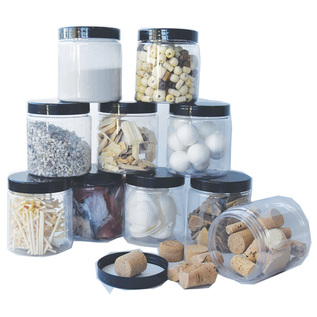 This natural material set is supplied in reusable tubs. 10 different natural collage materials from shells to beads, this set can be used for both collage and sensory play. Small parts: 5+ years.