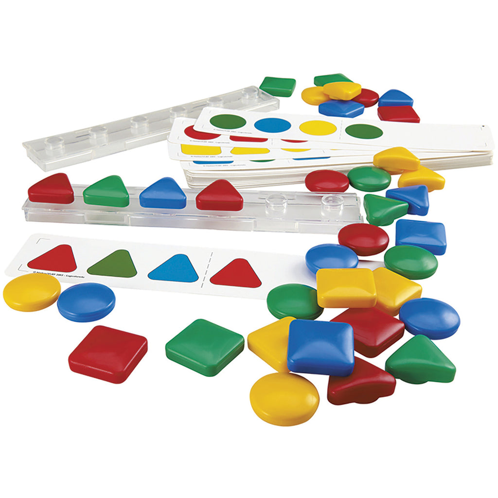 Children can snap play pieces in 3 different shapes and 4 different colours onto 6-stud transparent bases following instructions on cards they place under or next to the bases. Children can work in pairs as the bases can be clipped together to enable doing longer, more complex patterns. Contains: 30 activity cards 230 x 40mms, 2 transparent plastic bases 230 x 40mm with 6 studs, 36 plastic counters 33mm dia.: 3 shapes, 4 colours, 1 teacher's leaflet.