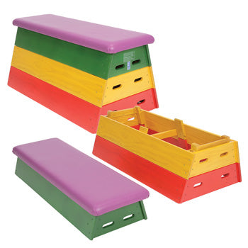 A vaulting box more suited to the younger gymnast and comprising 3 sections each with handholds for ease of lifting, and with rubber feet so that the top can be used either on its own or with 1 or 2 additional sections. The base is made from colour stained natural timber with a brightly coloured PVC padded top. 1340 x 630 x 680mm (lxhxw) at base. A constantly evolving range of equipment aimed at children aged between 3-11 years, enabling the development of a variety of movement and gymnastic skills. Complete ranges of soft play shapes which assist in the step-by-step development of active growing children. Each range is carefully designed to provide a progressively challenging environment for gymnastics and movement. PVC is flame resistant to BS5867 Part 2: 2008 Type B. Foam flame resistant to BS5852 Part 2 Ignition Source 5. The Jump for Joy range is endorsed by British Gymnastics.