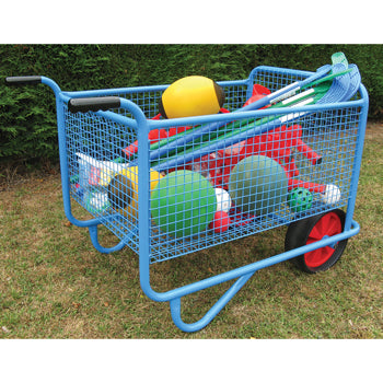 Wheelbarrow style trolley suitable for use outdoors. Manufactured from mild steel, powder coated blue. Dimensions: 1060 x 660 x 720mm (lxdxh). Please note: all units are supplied empty.