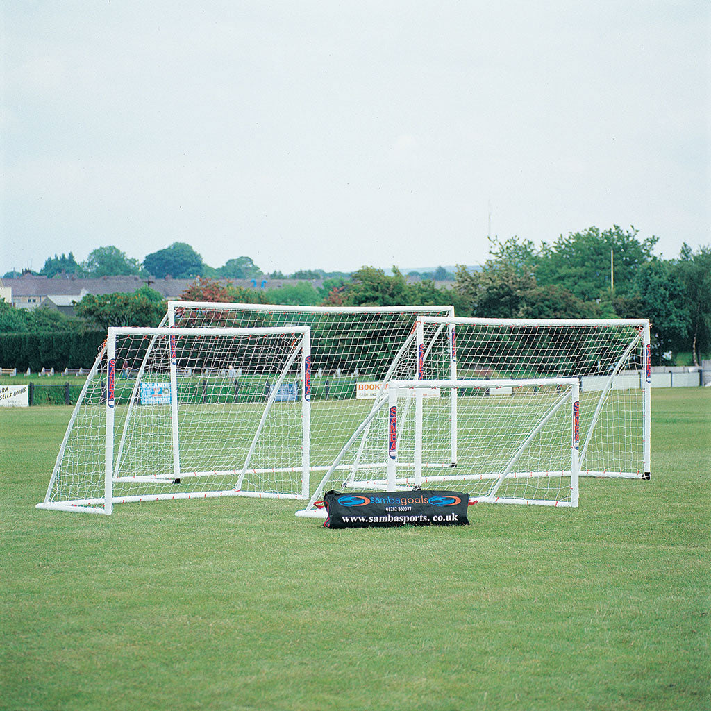 The Samba Multi Goal is a highly versatile portable goal constructed from white PVC with sprung button locking fixings. Supplied complete with net, net clips and ground anchors, it can be assembled as: 2.44 W x 2.14m H (8’x7’), 2.44 W x 1.83m H (8’x6’), 3.66 W x 2.14m H (12’x7’), 3.66 L x 1.83m H (12’x6’), 4.88 W x 2.14m H (16’x7’), or 4.88 W x 1.83m H (16’x6’). (Old Ref FB5310)