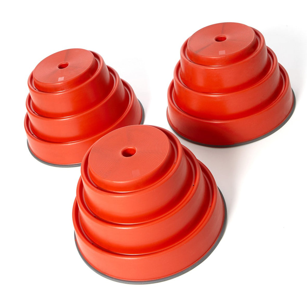 Red tops are made of plastic with artificial rubber edges to avoid slipping. Stackable for easy storage.