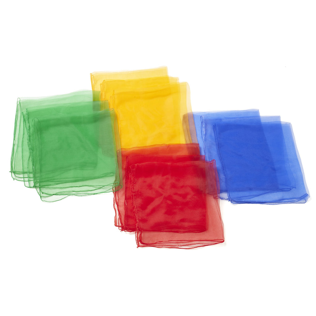Light nylon scarves in happy colours (yellow, red, blue, and green) which are an invitation for children to play!