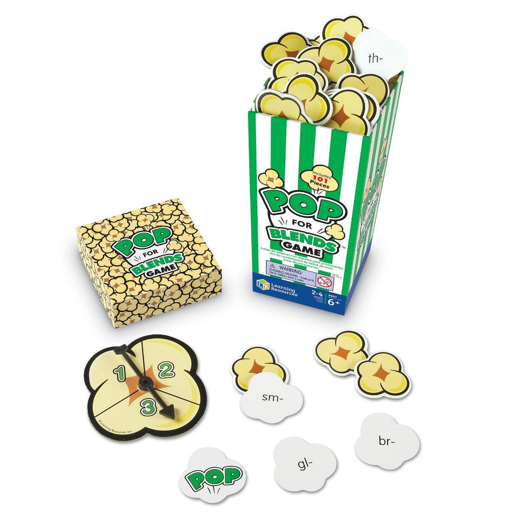 Learning Resources POP Games POP for Blends. Reach into this popcorn themed game box to help children improve their spelling skills! This Learning Resources POP game features popcorn shaped cards that feature a variety of beginning blends, including bl, br, ck, cl, ch, cr, dr, fl, fr, gl, gr, id, it, kn, lk, mp, nd, ng, nk, ph, pl, pr, sc, sh, sk, sl, sm, sn, sp, st, sw, tr, th, wh. Children simply pick a card from the box before stating and correctly using the featured blend. If they use the beginning blend correctly they get to keep the card. The extra 'POP' cards keep children on their toes. This fast paced game promotes fluency. Literacy game features two levels of play to extend the learning. Suitable for ages 6+.