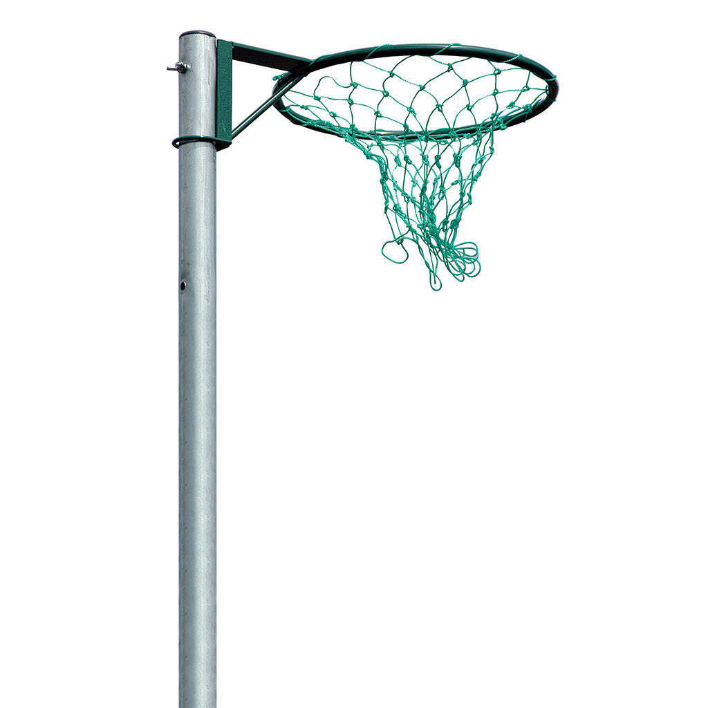 Powder coated tubular steel ring (dia. 38cm) with net, fitted with safety collar and a welded diagonal brace. To fit post dia. 50mm. Green ring conforming to England Netball regulations. Dia. 16mm.