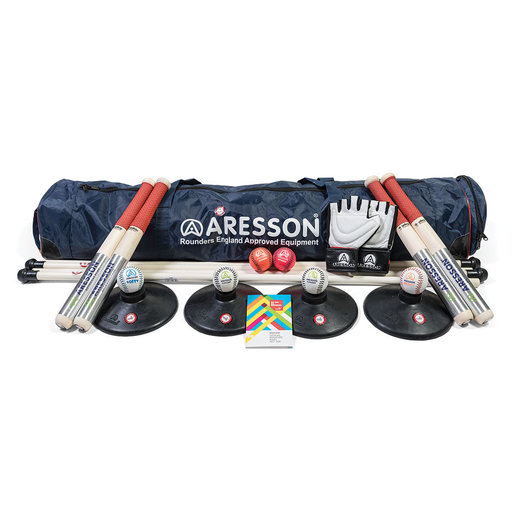 A top of the range inclusive set for schools and tournaments. Contents: 4 x 1.2m posts with bases and safety caps, 4 x Autocrat Plus bats, 2 x white Autocrat balls, 1 x pink Autocrat ball, 1 x orange Autocrat ball, 1 x Aresson Bullet ball, 1 x Aresson Softy ball, 2 x catching gloves (size to suit), 1 x Rounders England Official Rules booklet, 1 x Aresson rounders bag.