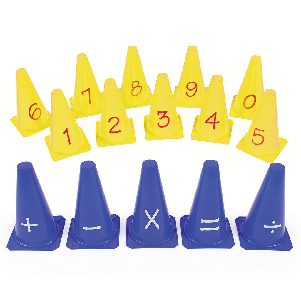 Contains a set of 10 Numbered Cones and a set of 5 Operation/Symbol Cones. Height 23cm.