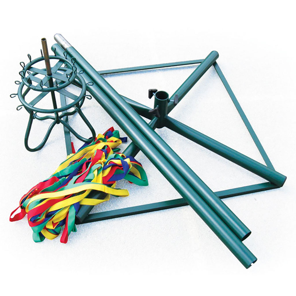 Green powder coated sturdy steel construction, the pole is sectional for storage whilst the Crown features sufficient hooks for 24 dancers. Supplied complete with 24 brightly coloured ribbons with hand loops in four colours. Base size: 95 L x 95cm W. Overall height: 3.66m. SE1450-RIB is for spare ribbons only.